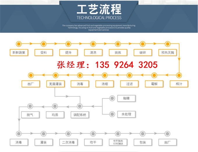 清洗(清洗機(jī))—檢果(檢果機(jī))—破碎(破碎機(jī))—打漿(打漿機(jī))—榨汁(榨汁機(jī))—過濾(過濾器)—濃縮(濃縮器)—調(diào)配(調(diào)配罐)—滅菌(滅菌機(jī))—無菌儲存(無菌貯罐)—無菌灌裝—成品包裝