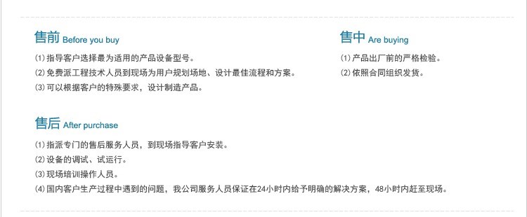 3.服務(wù)時間承諾:生產(chǎn)設(shè)備到達顧客廠房前請與售后服務(wù)部預約調(diào)試人員到達現(xiàn)場時間,根據(jù)要求會按期到達現(xiàn)場,設(shè)備運行中出現(xiàn)緊急情況不能處理時,直接反饋到售后服務(wù)部,工作時間外請于合同當事人或營銷負責人取得聯(lián)系,當接到通知后12小時到達現(xiàn)場。