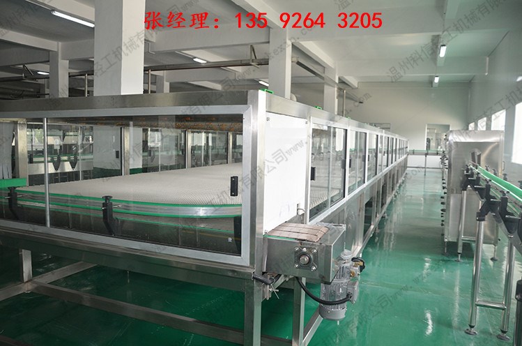 設(shè)置了兩段區(qū)間,主要是巴氏滅菌區(qū)和恒溫區(qū),此區(qū)設(shè)置了2個(gè)水箱,就是把蒸汽通入水箱加熱到所需要的溫度后,再由泵抽送到網(wǎng)帶上方噴淋,工作方式和上面兩個(gè)一樣。滅菌區(qū)的熱水溫度由溫度控制儀自動(dòng)控制,滅菌時(shí)間由滅菌工藝確定,也可通過(guò)調(diào)整無(wú)極變速器的轉(zhuǎn)速來(lái)改變。